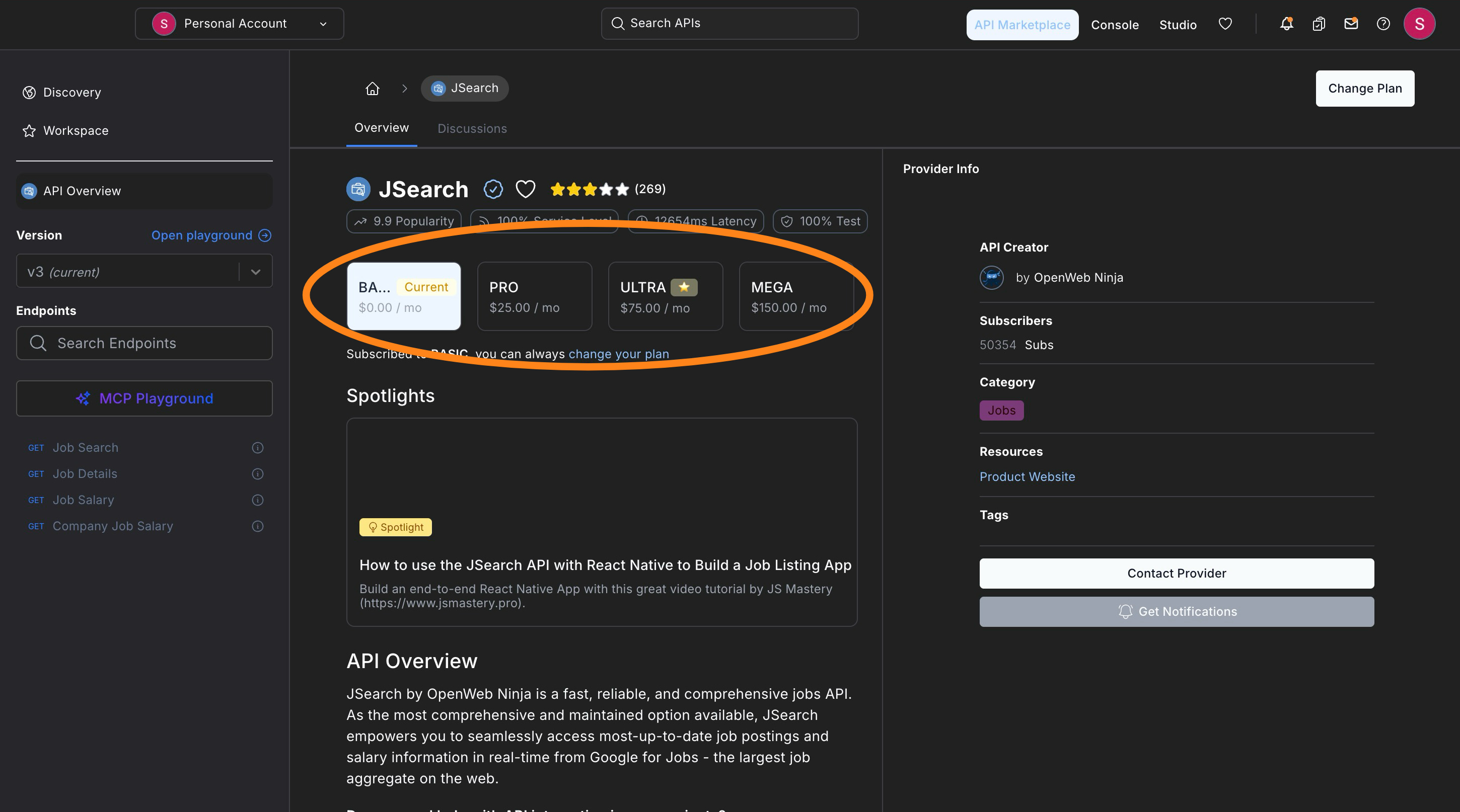 Tu arrives sur la présentation de l’API. JSearch permet de scrapper les offres d’emploi publiées sur Google Jobs : titre de poste, description, localisation, date de publication. C’est un peu comme faire une recherche booléenne sur LinkedIn, mais avec le plus grand agrégateur d’emploi du monde.