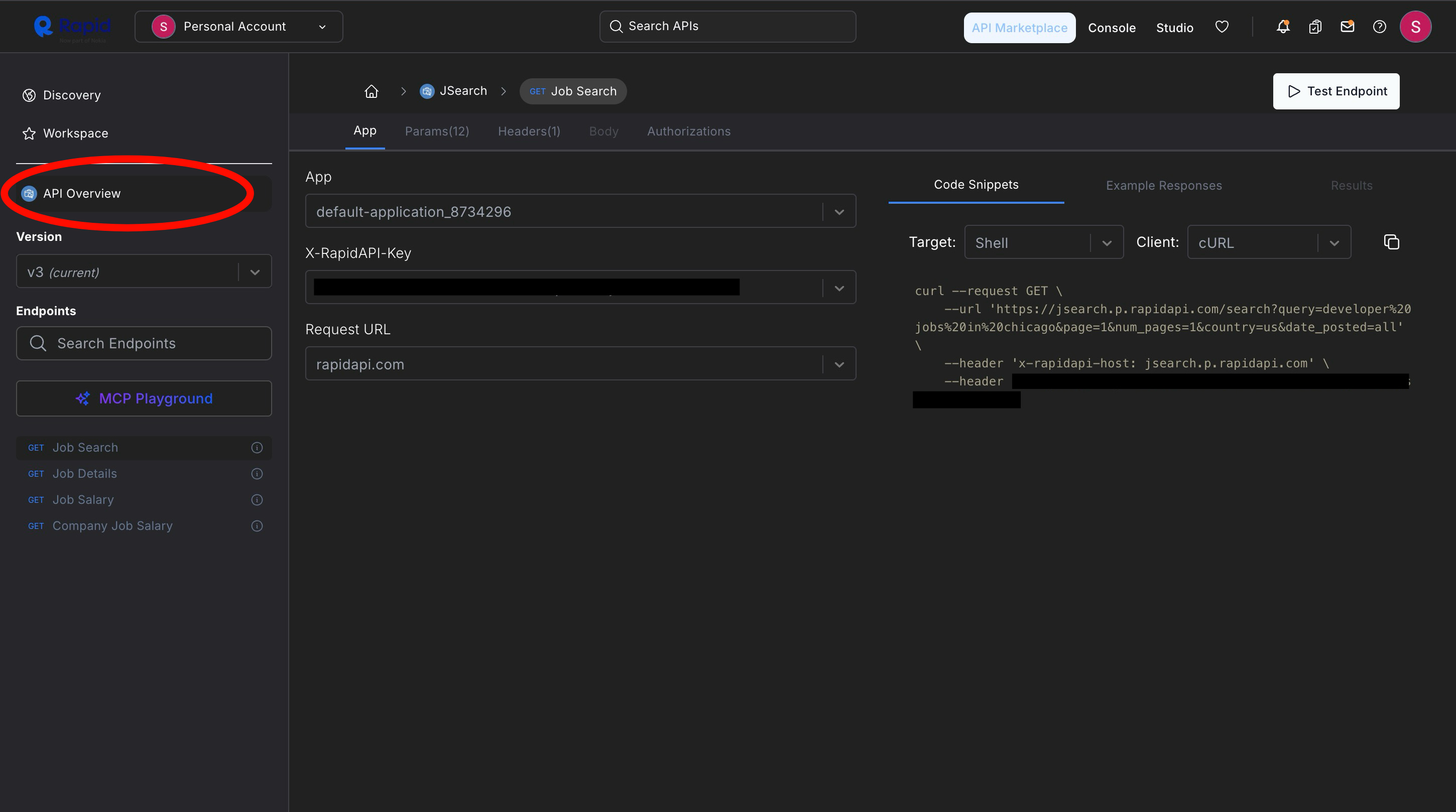 Clique sur API Overview (dans le cercle rouge de l’image).